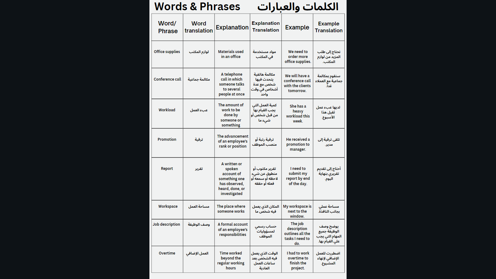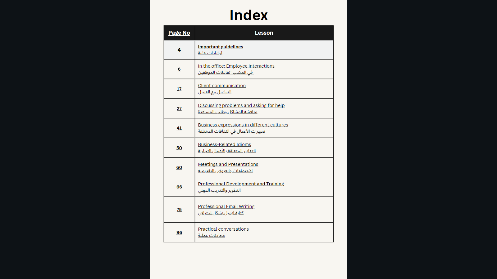 يتكون الكتاب من 106 صفحة، مقسمة إلى فصول تغطي مختلف جوانب التواصل في بيئة العمل. يحتوي كل فصل على جمل وعبارات ومصطلحات ثقافية